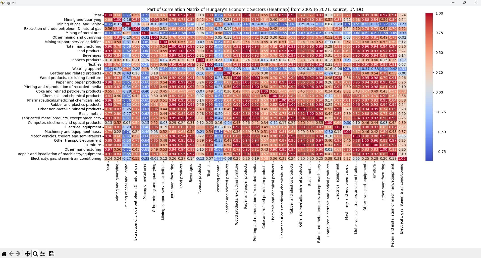 Korrelációs Heatmap Magyarország gazdasági szektorairól